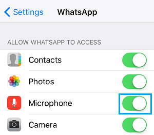 Buka Pengaturan > Gulir ke bawah ke tab WhatsApp > Di layar berikutnya, pindahkan sakelar di sebelah Mikrofon dan Kamera ke posisi Nyala.