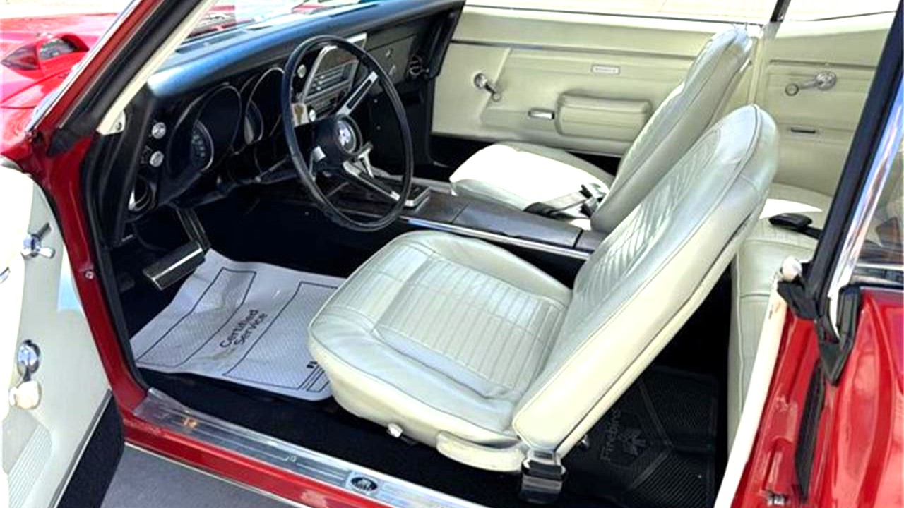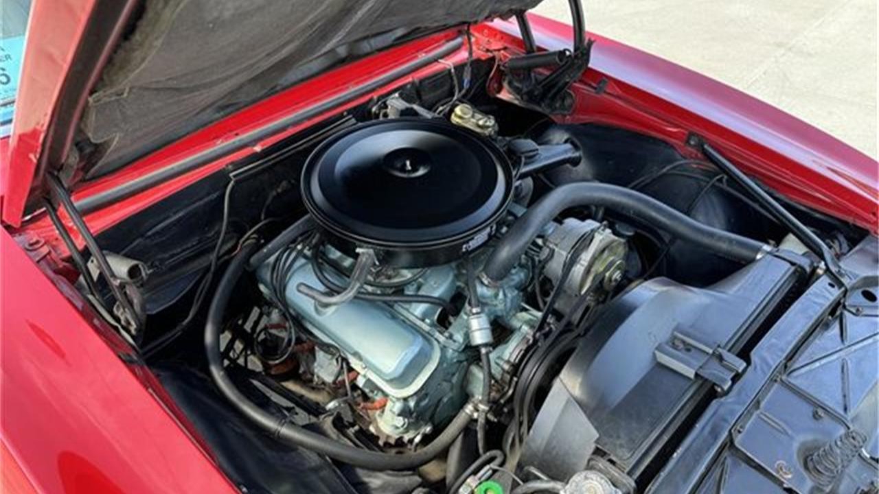 Coupe Pontiac Firebird HO tahun 1968 berwarna merah ini memiliki tenaga 320 hp dan 350 hp yang didukung transmisi otomatis dua percepatan. Deskripsinya tidak menjelaskan banyak hal, tetapi saya melihat atasan vinil putih, roda Rally II, konsol, dan radio AM/FM. Tidak ada paket pengukur, tetapi Anda dapat melacak putaran menggunakan sakelar kap mesin.